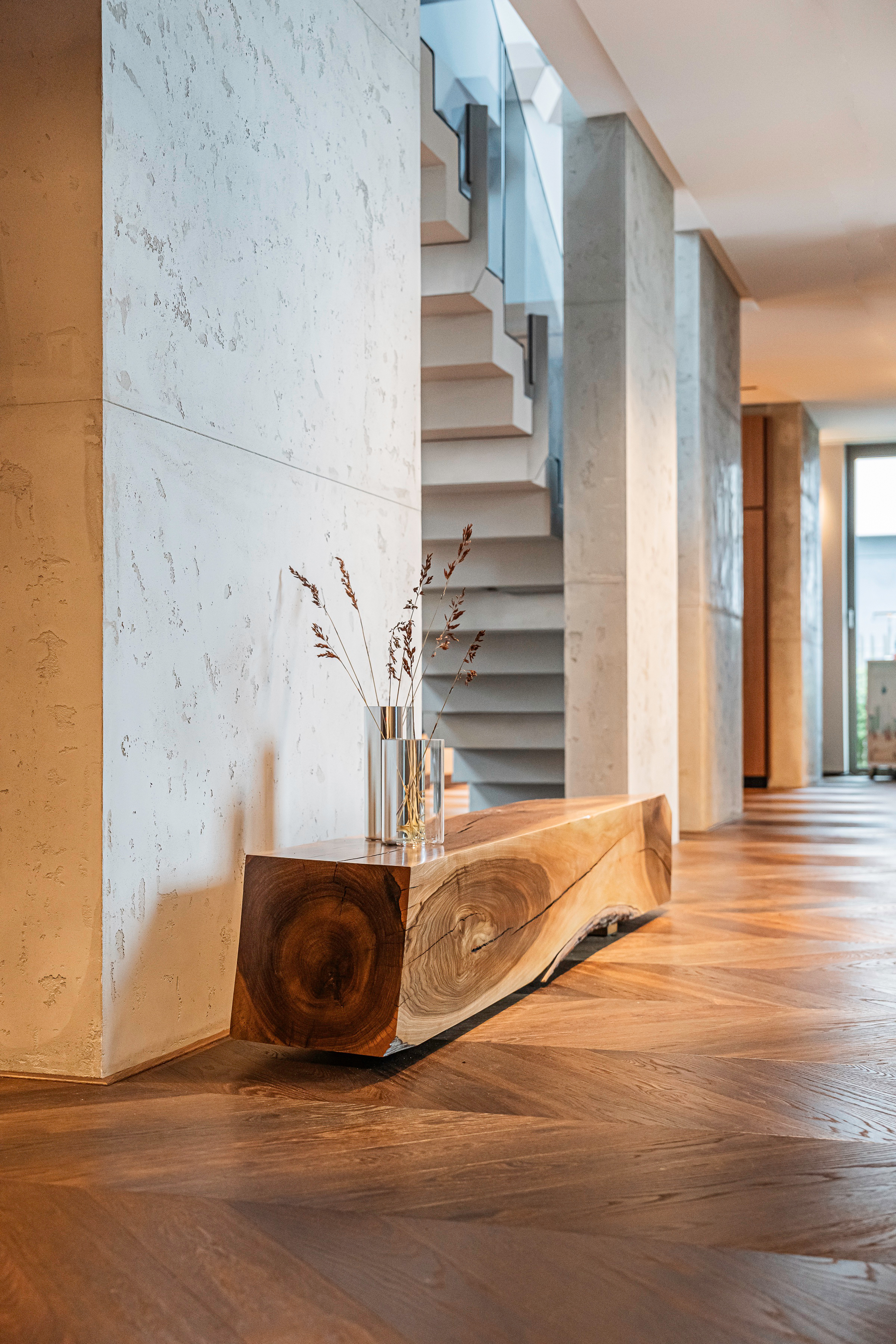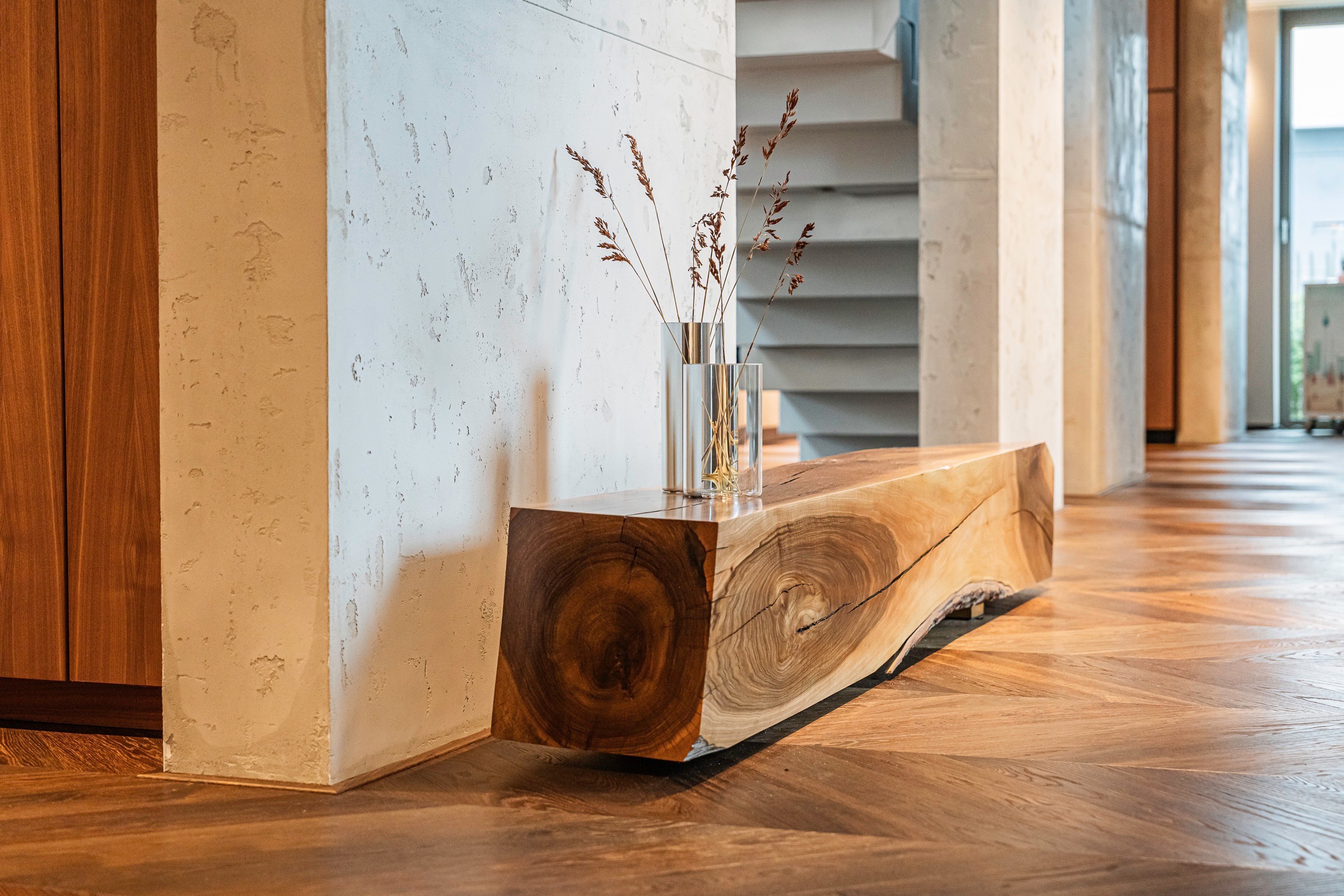 Der Nussbaum-Balken ist mehr als nur ein Gestaltungselement – er ist ein Statement. Als imposanter Solitär unterstreicht er das ganzheitliche Designkonzept, das die Möblierung dieses Hauses prägt.